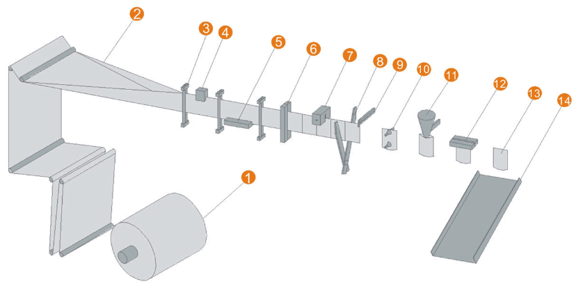 1. 放膜機構(gòu) 2.包裝膜成型 3. 包裝膜導(dǎo)向 4. 色標(biāo)檢測5. 底封機構(gòu) 6. 豎封機構(gòu) 7.易撕口裝置 8. 剪切機構(gòu) 9. 牽袋機構(gòu)  10. 開袋機構(gòu) 11. 充填 12. 上封  13. 成品 14. 成品輸出