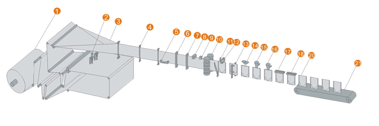 1. 放膜機(jī)構(gòu) 2. 底部沖孔 3.包裝膜成型 4. 包裝膜導(dǎo)向 5. 底封機(jī)構(gòu) 6. 豎封機(jī)構(gòu)I 7. 豎封機(jī)構(gòu)II 8.易撕口裝置 9.色標(biāo)檢測 10. 伺服牽袋 11. 剪切機(jī)構(gòu)  12. 夾袋 13. 開袋機(jī)構(gòu) 14. 吹氣裝置  15. 充填I(lǐng)  16. 充填I(lǐng)I  17. 上封I   18. 上封II   19. 成品 20. 成品輸出