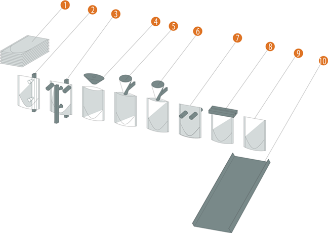 1.預(yù)制袋疊放  2. 翻轉(zhuǎn)取袋機(jī)構(gòu)  3. 開袋機(jī)構(gòu)  4. 吹氣機(jī)構(gòu)   5. 一次灌裝   6. 二次灌裝   7. 展袋  8. 上封  9. 成品  10. 成品輸出