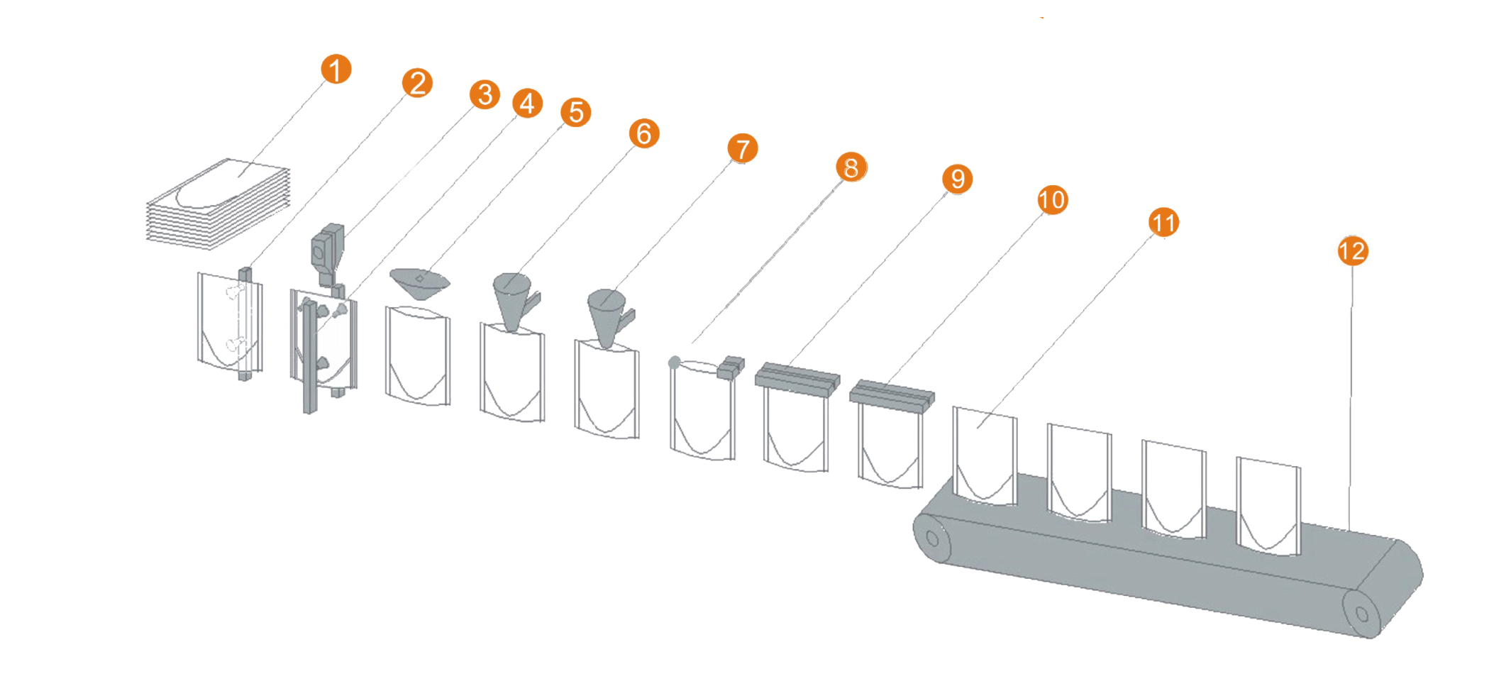 1.預(yù)制袋疊放  2. 翻轉(zhuǎn)取袋機(jī)構(gòu)  3. 開拉鏈機(jī)構(gòu)   4. 開袋機(jī)構(gòu)  5. 吹氣機(jī)構(gòu)   6. 一次灌裝   7 二次灌裝  8. 展袋  9 上封 I  10. 上封 II    11. 成品  12. 成品輸出
