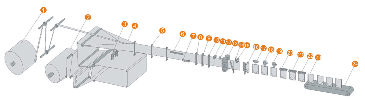 1.放拉鏈機(jī)構(gòu)  2. 放膜機(jī)構(gòu)  3. 底部沖孔 4.包裝膜成型 5. 包裝膜導(dǎo)向 6. 上封拉鏈 7. 底封機(jī)構(gòu) 8. 豎封拉鏈機(jī)構(gòu) 9. 豎封機(jī)構(gòu)I 10. 豎封機(jī)構(gòu)II 11.易撕口裝置 12.色標(biāo)檢測(cè) 13. 伺服牽袋 14. 剪切機(jī)構(gòu)  15. 夾袋 16. 開(kāi)袋機(jī)構(gòu) 17. 吹氣裝置  18. 充填I(lǐng)  19. 充填I(lǐng)I  20. 展袋 21. 上封I   22. 上封II   23. 成品 24. 成品輸出