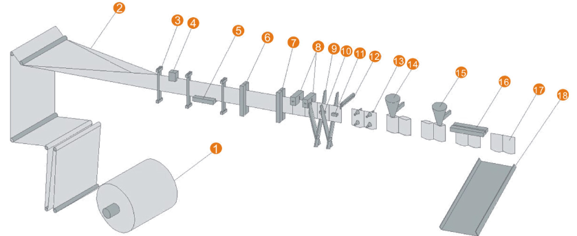 1. 放膜機(jī)構(gòu) 2.包裝膜成型 3. 包裝膜導(dǎo)向 4. 色標(biāo)檢測(cè)5. 底封機(jī)構(gòu) 6. 豎封機(jī)構(gòu) 7. 豎封機(jī)構(gòu)II  8.易撕口裝置 9. 雙剪切機(jī)構(gòu) 10 夾袋機(jī)構(gòu) 11. 夾袋機(jī)構(gòu)  12. 牽袋機(jī)構(gòu)  13. 開(kāi)袋機(jī)構(gòu) 14. 充填I(lǐng)  15. 充填I(lǐng)I 16. 上封  17. 成品 18. 成品輸出