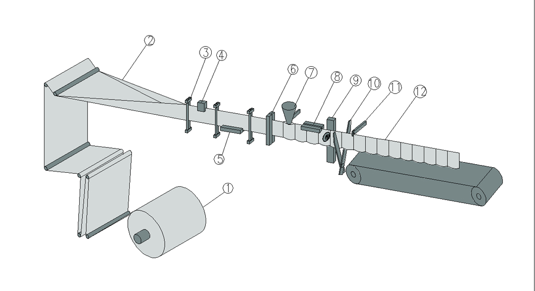 1. 放膜機(jī)構(gòu) 2.包裝膜成型 3. 包裝膜導(dǎo)向 4. 色標(biāo)檢測(cè)5. 底封機(jī)構(gòu) 6. 豎封機(jī)構(gòu) 7. 充填  8. 上封 9.滾刀虛刀裝置  10. 剪切機(jī)構(gòu) 11. 牽袋機(jī)構(gòu)  12. 成品輸出