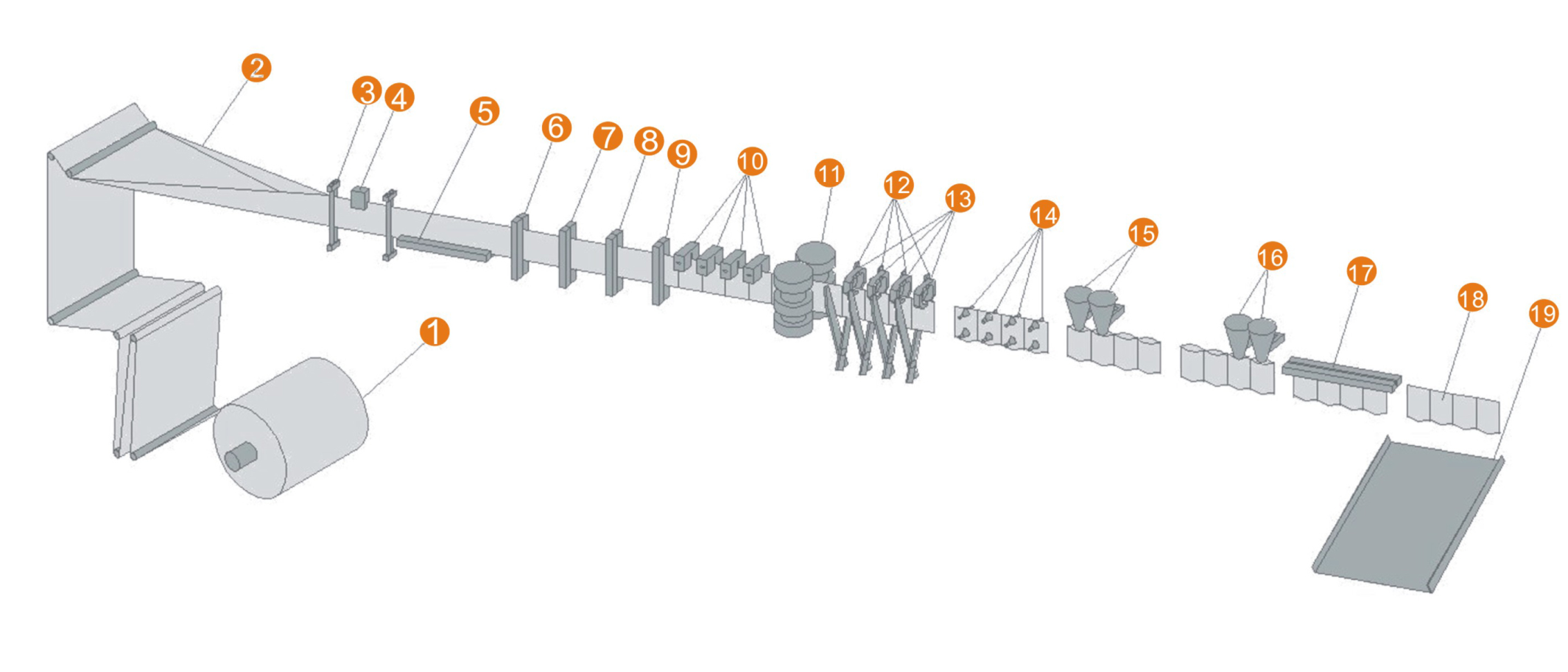 1.放膜機構 2.包裝膜成型 3.包裝膜導向 4.色標檢測 5.底封機構 6.第一豎封 7.第二豎封 8.第三豎封 9.第四豎封 10.易撕口裝置 11.伺服牽袋 12.四剪切機構 13.四夾袋機構 14.四開袋機構 15.第一填充 15.第二填充 17.上封機構 18.成品 19.成品輸出