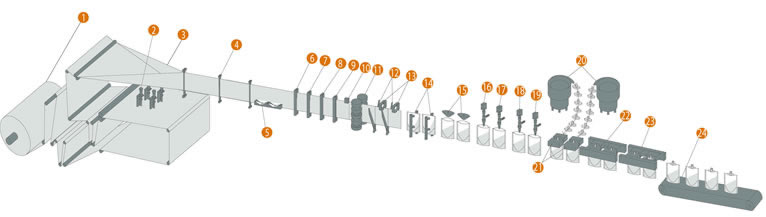 1放膜機構 2底部打孔 3包裝袋成型 4包裝膜導向 5底封 6豎封I 7豎封II 8豎封III 9豎封IIII 10色標檢測 11伺服牽袋 12剪切機構 13易撕口裝置 14開袋機構 15吹氣機構 16填充機構I 17填充機構II 18填充機構III 19填充機構IIII 20震動加嘴 21加嘴機構 22熱封 23冷封 24成品輸出
