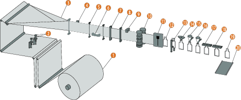 1. 放膜機構(gòu) 2. 底部沖孔 3.包裝膜成型 4. 色標檢測 5. 包裝膜導向 6. 底封機構(gòu) 7. 豎封機構(gòu)I 8.豎封機構(gòu)II 9. 易撕口裝置 10. 伺服牽袋 11. 剪切機構(gòu)   12. 夾袋I  13. 開袋機構(gòu) 14. 吹起裝置 15. 充填I(lǐng)  16. 充填I(lǐng)I 17. 上封裝置 18. 上封裝置 19. 成品 20. 成品輸出