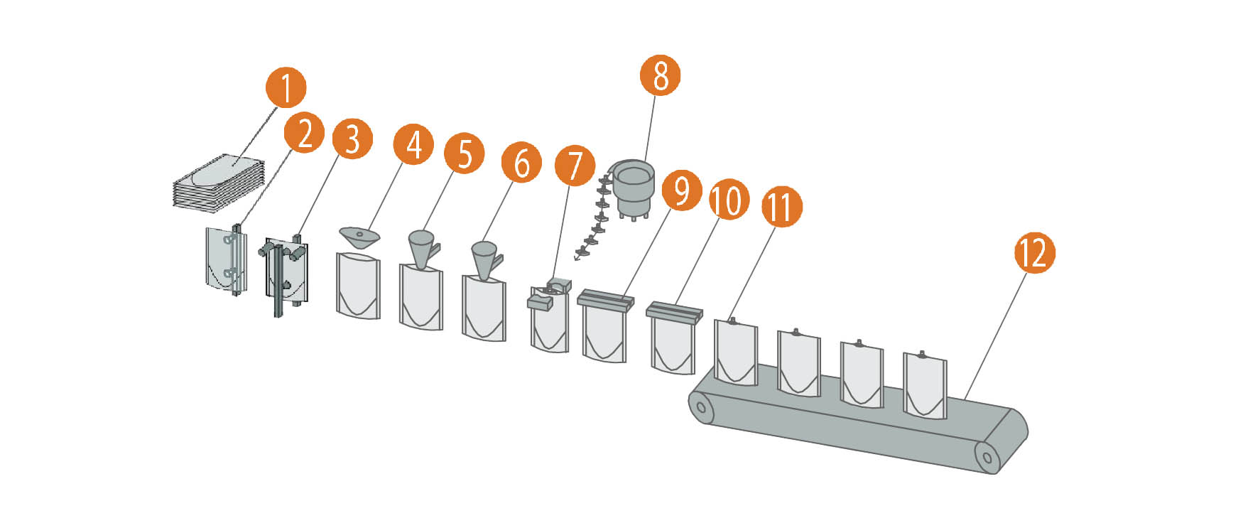 1.預(yù)制袋疊放 2. 翻轉(zhuǎn)取袋機(jī)構(gòu) 3. 開袋機(jī)構(gòu) 4. 吹氣機(jī)構(gòu) 5. 一次灌裝 6 二次灌裝 7. 加嘴裝置 8. 振動裝置 9 上封 I 10. 上封 II 11. 成品 12. 伺服托袋輸出